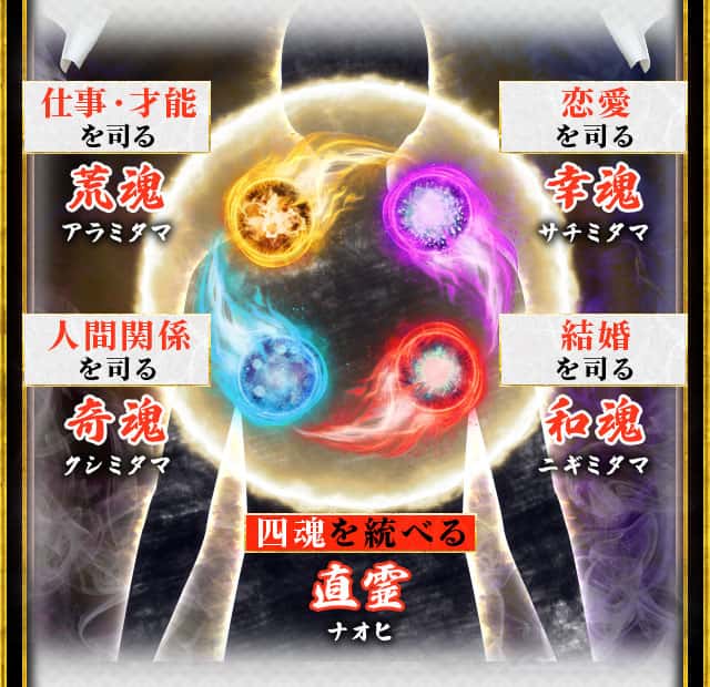 四つの魂を一つずつ捉え憑依させることで、あなたの「運命」や「結婚相手」、あの人の「本音」「想い」、二人の「恋の行方」や「結末」まで、すべてわかってしまうのです。